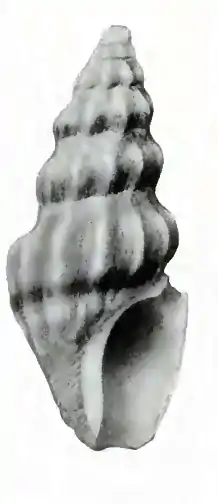 (Original description) The elongate-conic shell is wax-yellow with a broad pale-brown band at the periphery. The protoconch contains 2.5 smooth whorls 2.5, forming a pointed apex. The beginning of the postnuclear whorls has the axial riblets characteristic of the later postnuclear whorls, but here they are a little more slender and a little more closely approximated. The postnuclear whorls are marked by strong axial ribs that almost form cusps at the anterior termination of the posterior sinal region. They extend only very feebly across the sinal area, which occupies the posterior two-fifths of the whorls. On the body whorl these ribs are decidedly enfeebled on the base and evanesce at the junction with the columella. Of the axial ribs, 10 occur upon the first six whorls, 12 upon the seventh and the last whorl. These ribs are about one third as wide as the spaces that separate them, the latter being broad and concave. In addition to the axial ribs the whorls are marked by rather strong incremental lines that have a decidedly sigmoid curve, being retractively slanting at the posterior sinal region and protractively anterior to this. The spiral sculpture consists of numerous, closely spaced, microscopic obsolete spiral lines. The base of the shell is moderately well rounded. The columella is short and stubby, and is marked by 12 rather strong sinuous spiral threads and finer spiral lines corresponding to those on the spire and base. The aperture is moderately large and rather broad, decidedly channeled posteriorly and anteriorly with a feeble stromboid notch. The outer lip is protracted between the posterior angle and the stromboid notch into a clawlike element, while the inner lip is reflected over the columella as a heavy callus, which extends over the parietal wall and projects into the aperture at the posterior sinus as a decided knob. There is a heavy varix about one sixth of a turn behind the edge of the outer lip.[3]