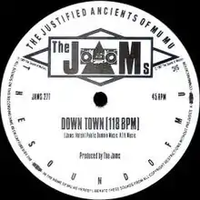 In 1987, Bill Drummond and Jimmy Cauty formed The Justified Ancients of Mu Mu (The JAMs), and busily released provocatively sample-heavy electronic music with beatbox rhythms and Drummond's socially aware raps. Their debut single "All You Need Is Love" and album 1987 (What the Fuck Is Going On?) were both investigated by the Mechanical Copyright Protection Society,[1] who ordered The JAMs to recall and destroy all unsold copies of 1987. A new single, "Whitney Joins The JAMs", followed, along with a satirically edited version of the album, 1987 (The JAMs 45 Edits), and the debut release from spinoff project Disco 2000, "I Gotta CD". By the time of the release of "Whitney Joins The JAMs", the duo's independent record label had been renamed KLF Communications, and in the coming year The Justified Ancients of Mu Mu would mutate into The KLF. In the meantime, "Down Town" was The JAMs' and KLF Communications' final release of 1987, a 7" and 12" single release of 30 November.[2] It did not enter the UK Singles Chart, but made inroads into the UK independent chart.[3]