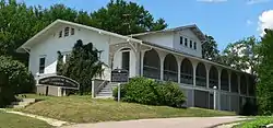 The Picotte Hospital building is located on the western fringe of Walthill, on the north side of Matthewson Street near its junction with Sawyer Street. The building was designed by architect William L. Steele in 1912 and built in 1912–1913. Set on a concrete foundation on a hill overlooking Walthill, the one-and-one-half-story hospital was built in the American Craftsman style of architecture. Typical of Craftsman style, it features a low-pitched, shingled (originally wood-shingled) roof, wide eaves with large braces beneath, exposed roof rafter tails, and a centered gabled dormer. A prominent screened porch runs the entire length of the front (east side) of the structure, bounded by columns that support the roof.[4]