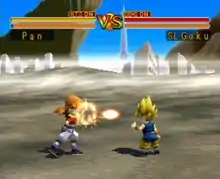 The game is similar to other Butōden series, playing out entirely in two dimensions but featuring 3D environments and characters from the Z and GT series of the Dragon Ball franchise.[2] The fighters can fly to almost any point on the playing field.[2] Unique in the game are special ki attacks called Special Knockout Trick. These are the spectacular versions of the character's ki attacks the character performs at a distance. When these attacks are performed, the camera cuts and pans to the attacking character, who powers up and fires. During the attacking character's power up, the opposing character has the opportunity to either retaliate or block when the word counter flashes on the lower right hand corner of the screen. If the player chooses to retaliate, they too power up and fire a ki attack, causing a power crossfire.[3] Whichever player presses their beam button the fastest will push their opponent's super back and force their own super to damage their opponent.[2] Another feature carried over from The Legend is the Meteor Smash technique. With a key combo, players can ignite a chain of mêlée attacks.[3]