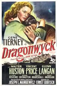 Dragonwyck is a 1946 American period drama film made by Twentieth Century-Fox.[3][4] It was directed by Joseph L. Mankiewicz, and produced by Darryl F. Zanuck and Ernst Lubitsch (uncredited), from a screenplay by Mankiewicz, based on the novel Dragonwyck by Anya Seton. The music score was by Alfred Newman, and the cinematography by Arthur C. Miller. The film stars Gene Tierney, Walter Huston, and Vincent Price.