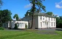 Ryefield House was described as "almost new" in 1851[5] and the estate possessed a fine 'U-shaped' stable block with a courtyard to the east of the mansion house as well as a large walled garden to the west. The mansion house is of a classical style, built of ashlar with a Doric porch and in the 1920s a single storey ballroom was added,[5] also used as an art gallery by William Barr Knox. William first married Gladys Burrell, a niece of Sir William Burrell the Scottish shipping merchant and philanthropist, made famous through the Burrell Collection. Edith Dunlop of Strathaven was the second wife of William Barr Knox, he is buried in Largs, however a commemorative plaque is also present at the Knox family memorial in Kilbirne 'Auld Kirk' cemetery where he is recorded as being of 'Redheugh and Ryefield'. His daughter was named Diana.