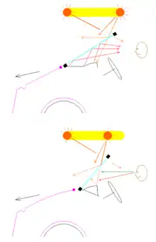 Blind spots also exist in front of boats.[27] When the boat accelerates, the bow rises, increasing the size of the blind spot. Large vessels can have up to several hundreds of meters of blind spot. This is generally known as the dead visual range of a ship. To address this, cameras are sometimes placed in the front of the vessel to cover the missing field of view.