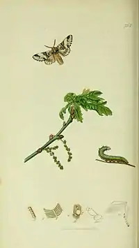 The larvae feed on various deciduous trees, primarily Quercus but also Fagus and Betula.[1] The male, but not the female comes to light. Females are rarely found at all, probably because they stay up in the tree crowns. After mating, the female lays 150 – 200 eggs in small groups on the underside of oak leaves, which hatch after eight to ten days. The newly hatched larvae usually live in small groups, older larvae live singly. They eat the leaves from the tip inwards so that only the middle nerve is left. When the larva is fully grown in August – September, it crawls down on the ground, spinning an oval, earthy cocoon and transforming into a pupa which overwinters. Sometimes the pupa can overwinter twice before hatching.