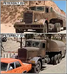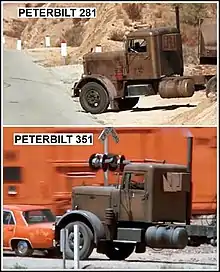 Spielberg had what he called an "audition" for the truck, wherein he viewed a series of trucks to choose the one for the film. He selected the older 1955 Peterbilt 281 over the current flat-nosed "cab-over" style of trucks because the long hood of the Peterbilt, its split windshield, and its round headlights gave it more of a "face", adding to its menacing personality.[4] Additionally, Spielberg said that the multiple license plates on the front bumper of the Peterbilt subtly suggested that the truck driver is a serial killer, having "run down other drivers in other states".[4] For each shot, several people were tasked to make it uglier; each successively adding oil, grease, fake dead insects and other blemishes.[9]