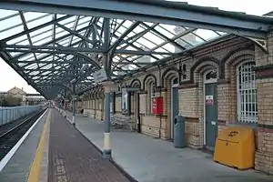 The ticket office and modern waiting area are located at road level, whereas the station proper is beneath this at track level. The two sections are connected by a Victorian covered walkway, and by a 21st-century lift for disabled access. The station is noted for its fine iron, glass, and polychromic brickwork. It has been said to be the finest station on the Dublin-Belfast line.[3]