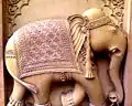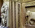 The stone work on the walls of temple building also emphasises the square shape. The temple wall has designs built in square shaped blocks and ornamental scrawls.