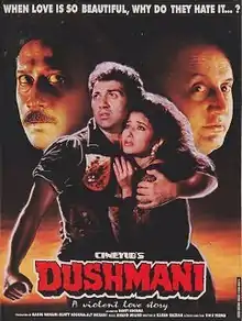 Dushmani: A Violent Love Story (lit. 'Enemies') is a 1996 Indian Hindi-language romantic action film directed by Bunty Soorma. It stars Jackie Shroff, Sunny Deol, Anupam Kher, Manisha Koirala and Deepti Naval in pivotal roles.[1][2] The rights of this film are now owned by Shah Rukh Khan's Red Chillies Entertainment.[3] Acclaimed director Shekhar Kapur directed major portions of the film.[4]