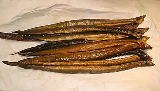 Other popular fish snacks are kibbeling (deep-fried, nugget-sized chunks of Atlantic cod), lekkerbekje (deep-fried cod, similar to the British fish and chips, but delicately spiced and with a more tempura-like batter), gerookte paling (smoked European eel), and rollmops.