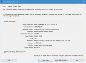 DxDiag ("DirectX Diagnostic Tool") is a diagnostics tool used to test DirectX functionality and troubleshoot video- or sound-related hardware problems. DirectX Diagnostic can save text files with the scan results. These files are often posted in tech forums or attached to support emails in order to give support personnel a better idea of the PC the requester is using in case the error is due to a hardware failure or incompatibility.