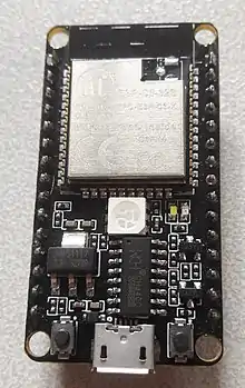 ESP32 is a series of low-cost, low-power system on a chip microcontrollers with integrated Wi-Fi and dual-mode Bluetooth. The ESP32 series employs either a Tensilica Xtensa LX6 microprocessor in both dual-core and single-core variations, Xtensa LX7 dual-core microprocessor or a single-core RISC-V microprocessor and includes built-in antenna switches, RF balun, power amplifier, low-noise receive amplifier, filters, and power-management modules. ESP32 is created and developed by Espressif Systems, a Shanghai-based Chinese company, and is manufactured by TSMC using their 40 nm process.[2] It is a successor to the ESP8266 microcontroller.