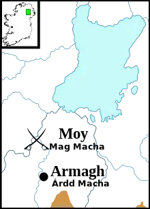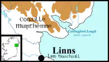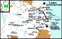 The following two years were marked by the fluctuating fortunes of both natives and invaders; alliances between the two were fluid and the conflict was relentless. Cerball mac Dúnlainge joined forces with his new overking Máel Sechnaill, while Amlaíb and Ímar aligned themselves with one of Máel Sechnaill's enemies, Áed Findliath of Ailech. In 860 Máel Sechnaill and Cerball took up arms against Áed Findliath and another of the High King's principal enemies, Flann mac Conaing of Brega, defeating them (though not decisively) at Moy near Armagh.[63] In 861 Áed and the Norsemen of Dublin jointly plundered Máel Sechnaill's territories in Mide,[64] but Máel Sechnaill defeated them at Drumomuy near the River Feegile on the border between County Offaly and County Kildare.[65] In 862 Áed, Flann and the Norsemen of Dublin once again invaded Mide, but Máel Sechnaill's death in November of that year effectively brought the campaign to an end. Áed Findliath succeeded him as High King.[66] After Máel Sechnaill's death his kingdom of Mide was divided among two claimants to the throne, Lorcán mac Cathail and Conchobar mac Donnchada.[67]