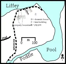 A handful of domestic habitations from the same period have also been found at Temple Bar West in the heart of the modern city. Typically these early houses were sunken structures, or Grubenhäuser, with wattle-lined walls, stone or wattle floors, and no hearths. They were built on the left bank of the Poddle close to its confluence with the Liffey. At a later date – possibly in the 9th century – these sunken structures were filled in and replaced with more densely spaced post-and-wattle structures indicative of more intensive settlement. These later dwellings are now identified as Type I houses, characterised by the possession of a central hearth flanked by two raised benches or bedding areas, a roof supported by four internal posts, and a doorway at each end of the building.[160] These houses have been compared to Norse dwellings that were built in the early 9th century at Kaupang in Vestfold, Norway.[161]