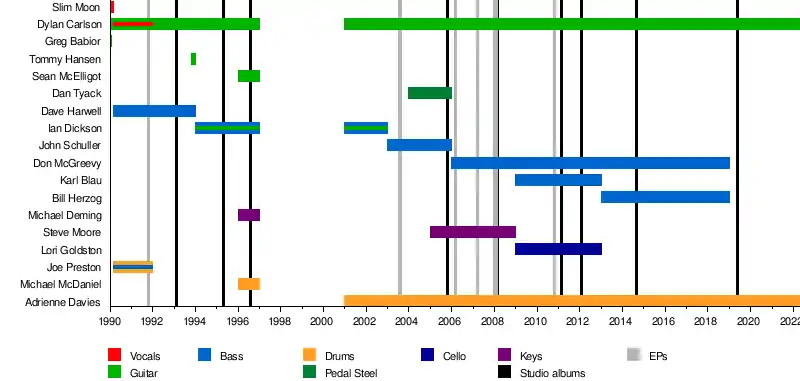 Earth is an American rock band based in Olympia, Washington, formed in 1989 and led by the guitarist Dylan Carlson.[1][5] Earth's music is nearly all instrumental, and can be divided into two distinct stages. Their early work is characterized by distortion, droning, minimalism, and lengthy, repetitive song structures. Owing to their 1993 debut album Earth 2, Earth is recognized as a pioneer of drone metal.[6] The band resurfaced in the early 2000s, with their later output reducing the distortion and incorporating elements of country, jazz rock, and folk.[6]