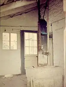 Day and night, the rams thumped every 20 seconds or so and were audible throughout East Dundry until the 1950s.[7] Walnut Farm ran their ram well into the mid sixties with the ram feed water supply coming from an open topped limestone cistern built into the south side of the valley containing approximately 12 cubic metres of water bubbling up from an underground spring. The ram was housed in a small shed 40 metres into the base of the valley next to the stream with the waste wash from the ram flowing into it. The delivery pipe from the ram ran north up to a holding tank at the farm. Once a mains water supply was installed (1957/8) the water from the ram was used solely for livestock and washing down the yards. The rhythmic thumping of the ram had a shorter frequency than the one mentioned at North Hill Farm with gentle knocks about every 3 to 4 seconds.