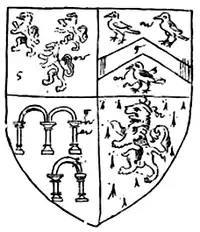 Another branch of the Arches family, bearing the same canting armorials of Gules, three arches argent,[6] had been established in Buckinghamshire since at the latest 1309,[3] and held the manors of Little Kimble, and in the parish of Waddesdon the manors of Eythrope[7] and Cranwell.[3] Richard Arches (d.1417) of Eythrope, was MP for Buckinghamshire in 1402. His eventual heir was John Dinham, 1st Baron Dinham (1433–1501), the son of his daughter and heiress Joan Arches.[8]