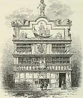 In 1648, therefore, it took a lease on the adjoining property, Craven House, a late Elizabethan mansion built by Sir Robert Lee, Lord Mayor of London, and named after one of his successors, Sir William Craven, who had occupied it at a later date.[4][5] By 1661 the building was known as East India House. In that year, the frontage was given an ornamental wooden superstructure decorated with paintings of some of the Company's ships, and surmounted by a wooden sculpture of a seaman.[6] Over the years following, various improvements and extensions were made to the premises; and in 1710 a contract was signed for the Company to buy the property from Lord Craven (although the purchase was not in fact completed until 1733).[7] Further extensions were made, but by the mid 1720s the mansion was considered to be in such poor condition, and the Company's need for additional space so pressing, as to justify complete rebuilding.[8] To allow this to take place, the Company moved into temporary premises in Fenchurch Street early in 1726.[9]