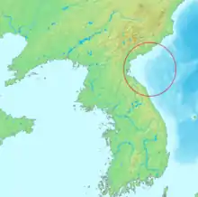 The East Korea Bay (Korean: 동조선만, 동한만), also formerly known in English as Broughton Bay,[1] is a bight in the east coast of North Korea and an extension of the Sea of Japan, located between the provinces of South Hamgyong and Kangwon. Its northern end is Musu Dan, near the Musudan Village missile site which gave its name to North Korea's Taepodong and Musudan missiles. Whaling was once common in the region, targeting species such as fin whales.[2]