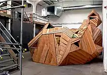 From the quirky wooden office (which is also an artwork entitled "Pleasure Island" by Heather and Ivan Morison),[3] to newly installed walls borrowed from the Vienna Secession, to regularly changing temporary display structures which re-use and re-work previous exhibits, Eastside Projects challenges what an art gallery can be, and has transformed over time into an evolving space which wears its history and influences on its sleeve. In 2011, Eastside Projects was accepted into Arts Council England's National Portfolio, securing funding for a further three years from 2012. The gallery has also received additional funding from a Paul Hamlyn Breakthrough Award and works in partnership with Birmingham City University who support the gallery through project funding and the use of equipment or facilities. Eastside Projects is a not-for-profit company limited by guarantee.