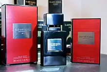 The Eau de Gaga's bottle is black and meant to simulate both masculine and feminine aesthetics and comes in a rectangular red box. The front of the box reads "Eau de Gaga: Paris New York 001". The 001 is referring to this fragrance being the first out of the entire collection, which is still to be continued.[3] There is also a body lotion and shower gel which is sold separately from the fragrance. The bottles for both the body lotion and shower gel are slim and both have the same box design as the fragrance. The fragrance is available in 15ml, 30ml, 50ml and 75ml. Both the body lotion and the shower gel are available in 75ml and 200ml.[4]