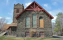 In 1946, the congregation decided to construct a manse for the pastor. The manse was situated south of the sanctuary and constructed in a rustic style to blend with the sanctuary. In 1987, the congregation constructed a new facility to house offices, activity space and classrooms. The facility is two-floors and occupies a plot 25 ft × 69 ft (7.6 m × 21.0 m) between the sanctuary and manse forming a courtyard on the east. Because of the slope of the site, the facility appears to be only one story. As part of the addition, the partition was removed from the sanctuary and new pews and carpeting were installed.[2]