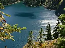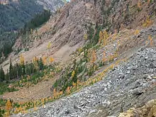 The mid-elevation forests in the North Cascades with an elevation between 2,000 to 4,300 feet (600 to 1,300 m) is the Silver Fir Ecoregion.[6] The Silver Fir Ecoregion makes up for much of the valleys in the Alpine Lakes area. The average annual temperature in this ecoregion is 42 °F (6 °C) and the average precipitation in centimeters is between 220–280 centimetres (87–110 in).[8] Typical montane forests in this ecoregion is dominated by Pacific silver fir and also contains noble fir, Douglas fir, and Alaska yellow-cedar.[6][8] Coarse woody debris is very characteristic of the Silver Fir Ecoregion, providing microsites for organisms. The Pacific silver fir zone is in some of the steepest parts of the topography and heavy snow often leads to avalanche gullies.[6] In every major drainage basin along the western slopes of the Cascade Mountains there is evidence of avalanche tracks breaking up the forested vegetation with nonforested vegetation.[6] These gullies provide sites of new successional growth as they move toward a coniferous forest again.[6] Because of the dense forests of the Silver Fir Ecoregion, it was the preferred area for commercial logging prior to designation of areas as wilderness.