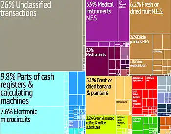In 2015 the following were the major export products (US$): medical instruments ($2 billion), bananas ($1.24B), tropical fruits ($1.22B), integrated circuits ($841 million) and orthopedic appliances ($555M). The total exports in 2015 were US$12.6 billion, down from $18.9B in 2010; bananas and medical instruments were the two largest sectors. Total imports in 2015 were $15B, up from $13.8B in 2010; this resulted in a trade deficit.[26]