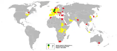 Agricultural products supply a significant portion of Uganda's foreign exchange earnings, with coffee alone, of which Uganda is Africa's second largest producer after Ethiopia,[29] accounting for about 17% of the country's exports in 2017 and earning the country US$545 million.[29] Exports of apparel, hides, skins, vanilla, vegetables, fruits, cut flowers, and fish are growing, while cotton, tea, and tobacco continue to be mainstays.[30]