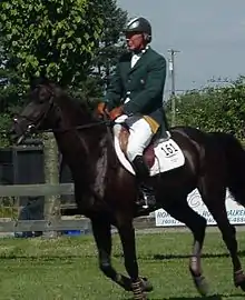 Eddie Macken (born 20 October 1949 in Granard, Longford, Ireland)[1] is an Irish equestrian show jumper, who was a member of the Irish team - along with Paul Darragh, Capt. Con Power, and James Kernan – that won the Aga Khan Cup three years in a row (1977 to 79). Other notable career highlights include a record four consecutive Hickstead Derby wins (1976 to 79), two individual silver medals at the Show Jumping World Championships, 1974 with Pele and 1978 on Boomerang, and an individual silver medal at the 1977 European Championships with Pele. Macken has many major Grand Prix victories worldwide. Many of Macken's achievements were gained in partnership with his Irish bred gelding, Boomerang. From Macken's first rides with Boomerang as a four-year-old in 1970, the pair blazed a trail of wins that lasted a decade.[2]
