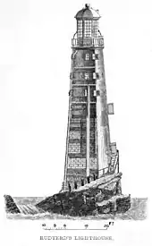 Rudyard's lighthouse, in contrast to its predecessor, was a smooth conical tower, shaped 'so as to offer the least possible resistance to wind and wave'.[13] It was built on a base of solid wood, formed from layers of timber beams, laid horizontally on seven flat steps which had been cut into the upper face of the sloping rock. On top of this base rose several courses of stone, interspersed with further layers of wood, which was designed to serve as ballast for the tower. This substructure rose to a height of 63 feet (19 m), on top of which were raised four storeys of timber. The entire structure was sheathed in vertical wooden planks and anchored to the reef using thirty-six wrought iron bolts, forged to fit deep dovetailed holes which had been cut in the reef.[14] The vertical planks were installed by two master-shipwrights from Woolwich Dockyard and were caulked like those of a ship.[9] The tower was topped with an octagonal lantern, which brought it to a total height of 92 feet (28 m).[13] A light was first shone from the tower on 28 July 1708[15] and the work was completed in 1709. The light was provided by 24 candles.[9] Rudyard's lighthouse proved more durable than its predecessor, surviving and serving its purpose on the reef for nearly fifty years.[5]