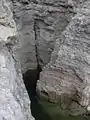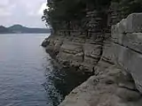 The park is situated amidst rolling hills ("knobs") that comprise part of the geological boundary between the Eastern Highland Rim and the Central Basin. These hills are typically underlain by Mississippian period limestone, the erosion of which has created karst-like formations throughout the Center Hill Basin.[1] Outcroppings of this limestone are visible along the cliffs overlooking the lake.