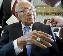Edmond Andrew Harjo (November 24, 1917 – March 31, 2014) was an American Seminole Code Talker during World War II.[1] Harjo, who served with his brothers at the Normandy landings and the Battle of the Bulge, was the last surviving code talker from the Seminole Nation of Oklahoma.[2][3][4] On November 20, 2013, a group representing thirty-three Native American tribes were awarded the Congressional Gold Medal, the highest civilian honor bestowed by the United States Congress, for their service as code talkers.[1][4] Harjo was the only surviving code talker present.[4] He was presented with a silver duplicate of the gold medal representing his tribe.[4]