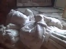 The location of Edward's burial is unknown. A mutilated white alabaster cenotaph ("empty tomb")[15] in the Church of St Helen and the Holy Cross at Sheriff Hutton, with an effigy of a child, was long believed to represent Edward of Middleham, but is now thought to be an earlier work depicting one of the Neville family.[16]
