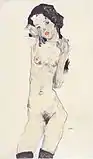 In 1910, Schiele began experimenting with nudes and within a year a definitive style featuring emaciated, sickly-coloured figures, often with strong sexual overtones. Schiele also began painting and drawing children.[8] Schiele's self portrait, Kneeling Nude with Raised Hands (1910), is considered among the most significant nude art pieces made during the 20th century. Schiele's radical and developed approach towards the naked human form challenged both scholars and progressives alike. This unconventional piece and style went against strict academia and created a sexual uproar with its contorted lines and heavy display of figurative expression. At the time, many found the explicitness of his works disturbing.