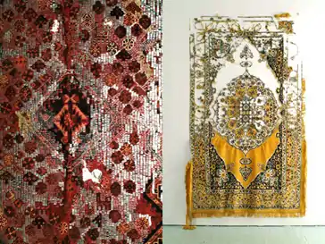 Elana Herzog, Civilization and Its DisContents, Persian and Persian-type carpets, mixed fabrics and media, and metal staples, dimensions variable, 2003/5. Installation views at Smack Mellon, Brooklyn, NY. Left: close-up view.