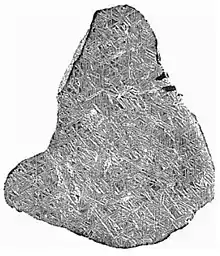 |  1908 macrograph of the Elbogen meteorite, by Alois von Widmanstätten. The nitric acid etched surface was inked and used as a printing plate to outline the structure in relief. | |