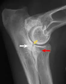 Elbow dysplasia is a condition involving multiple developmental abnormalities of the elbow-joint in the dog, specifically the growth of cartilage or the structures surrounding it. These abnormalities, known as 'primary lesions', give rise to osteoarthritic processes.[1] Elbow dysplasia is a common condition of certain breeds of dogs.