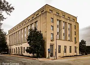 The building is an impressive five-story structure, creating the illusion of a solid limestone mass rising to a height of 94 feet. It is designed in the Art Moderne style, incorporating classical elements. A steel and concrete structure faced with limestone veneer, each elevation adheres to classical principles of symmetry and articulation by a regular rhythm of bays with a centralized principal entrance. Art Moderne elements are embodied by the sharp angles and zigzag surfaces seen in the stacked fenestration of the upper stories, and in the geometric, low-relief abstraction of the ornamentation.[2]