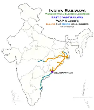 Being one of the two electric engine sheds in East Coast Railway, various major and minor maintenance schedules of electric locomotives are carried out here. It has the sanctioned capacity of 175 engine units. Beyond the operating capacity, this shed houses a total of 320 engine units, including 21 WAP-4, 35 WAP-7, 83 WAG-5, 9 WAG-6 and 172 WAG-9. Like all locomotive sheds, VSKP does regular maintenance, overhaul and repair including painting and washing of locomotives.[1]