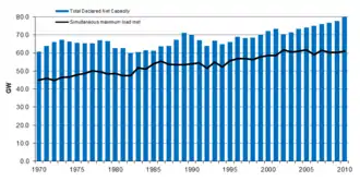 However, due to reducing demand in the late-2000s recession removing any medium term gap, and high gas prices, in 2011 and 2012 over 2 GW of older, less efficient, gas generation plant was mothballed.[33][34] In 2011 electricity demand dropped 4%, and about 6.5 GW of additional gas-fired capacity is being added over 2011 and 2012. Early in 2012 the reserve margin stood at the high level of 32%.[35]