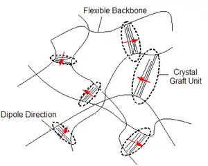 Electrostrictive graft polymers consist of flexible backbone chains with branching side chains. The side chains on neighboring backbone polymers cross link and form crystal units. The backbone and side chain crystal units can then form polarized monomers, which contain atoms with partial charges and generate dipole moments, shown in Figure 2.[13] When an electrical field is applied, a force is applied to each partial charge and causes rotation of the whole polymer unit. This rotation causes electrostrictive strain and deformation of the polymer.