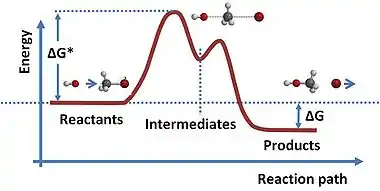 Atoms in molecules or solids are held together by chemical bonding, which stabilizes the molecule or solid (i.e. reduces its energy). When molecules or solids of relatively high energy are brought together, a spontaneous chemical reaction can occur that rearranges the bonding and reduces the (free) energy of the system.[32][33] In batteries, coupled half-reactions, often involving metals and their ions, occur in tandem, with a gain of electrons (termed "reduction") by one conductive electrode and loss of electrons (termed "oxidation") by another (reduction-oxidation or redox reactions). The spontaneous overall reaction can only occur if electrons move through an external wire between the electrodes. The electrical energy given off is the free energy lost by the chemical reaction system.[32]