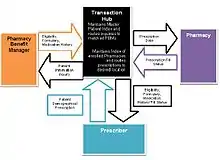 The transaction hub provides the common link between all actors (prescriber, pharmacy benefit manager, and pharmacy). It stores and maintains a master patient index for quick access to their medical information as well as a list of pharmacies.[3]