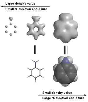 Electron density calculated for aniline, high density values indicate atom positions, intermediate density values emphasize bonding, low values provide information on a molecule's shape and size.