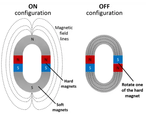 An electropermanent magnet or EPM is a type of permanent magnet in which the external magnetic field can be switched on or off by a pulse of electric current in a wire winding around part of the magnet. The magnet consists of two sections, one of "hard" (high coercivity) magnetic material and one of "soft" (low coercivity) material. The direction of magnetization in the latter piece can be switched by a pulse of current in a wire winding about the former. When the magnetically soft and hard materials have opposing magnetizations, the magnet produces no net external field across its poles, while when their direction of magnetization is aligned the magnet produces an external magnetic field.[1][2]