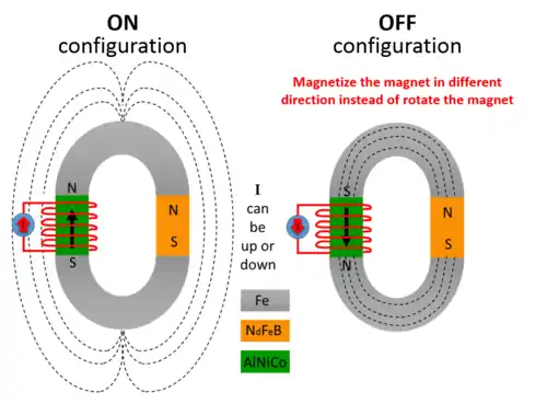 A coil is wound around one of the magnets in a way that if we inject enough current (in a pulse) in the solenoid the generated magnetic field inside will be higher than the intrinsic coercivity of the magnet (). If this is the case the permanent magnet will be magnetized in the direction of the field inside the solenoid. Applying the same pulse of current in the opposite direction will lead to magnetize the magnet in the opposite direction. Therefore, we have the same behavior as when we mechanically rotate the magnet. This configuration is the concept of electropermanent magnet: Using a pulse of current we reverse the magnetization direction of one of the magnets and we will turn ON and OFF the external magnetic field.