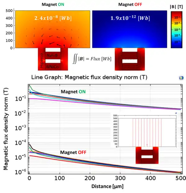 An example of an EPM of by is simulated to verify the difference in the magnetic field when the EPM is ON and OFF. This simulation was made using finite element approach by the software COMSOL Multiphysics®. The picture below shows a simulation of the Magnetic Flux density Field (B) for the EPM ON and OFF (with a calculation of the flux in that specific plane) and below shows multiple cross section measurements of the flux density on top of the EPM (ON and OFF as well). The simulations shown that there are at least 4 orders of magnitude of difference in the external magnetic fields between the two operation modes confirming the magnetic circuit model.