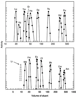 1969 studies on the element showed that lawrencium reacted with chlorine to form a product that was most likely the trichloride LrCl3. Its volatility was found to be similar to that of the chlorides of curium, fermium, and nobelium and much less than that of rutherfordium chloride. In 1970, chemical studies were performed on 1500 atoms of the isotope 256Lr, comparing it with divalent (No, Ba, Ra), trivalent (Fm, Cf, Cm, Am, Ac), and tetravalent (Th, Pu) elements. It was found that lawrencium coextracted with the trivalent ions, but the short half-life of the 256Lr isotope precluded a confirmation that it eluted ahead of Md3+ in the elution sequence.[50] Lawrencium occurs as the trivalent Lr3+ ion in aqueous solution and hence its compounds should be similar to those of the other trivalent actinides: for example, lawrencium(III) fluoride (LrF3) and hydroxide (Lr(OH)3) should both be insoluble in water.[50] Due to the actinide contraction, the ionic radius of Lr3+ should be smaller than that of Md3+, and it should elute ahead of Md3+ when ammonium α-hydroxyisobutyrate (ammonium α-HIB) is used as an eluant.[50] Later 1987 experiments on the longer-lived isotope 260Lr confirmed lawrencium's trivalency and that it eluted in roughly the same place as erbium, and found that lawrencium's ionic radius was 88.6±0.3 pm, larger than would be expected from simple extrapolation from periodic trends.[50] Later 1988 experiments with more lawrencium atoms refined this value to 88.1±0.1 pm and calculated an enthalpy of hydration value of −3685±13 kJ/mol.[50] It was also pointed out that the actinide contraction at the end of the actinide series was larger than the analogous lanthanide contraction, with the exception of the last actinide, lawrencium: the cause was speculated to be relativistic effects.[50]