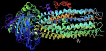 Ivacaftor is a selective small-molecule potentiator of the CFTR protein that increases the protein's ability to open chloride channels.[19][20] Its effectiveness is highly dependent on the amount of CFTR protein at the cell surface and the responsiveness of the mutant CFTR protein.[21] Ivacaftor's primary target is to treat class III CFTR gating mutations like G551D as well as other less common mutations.[20] In the crystalline figure, you can see ivacaftor, shown as a gray ball and stick model on the bottom-right, bound to CFTR docked in a cleft formed by transmembrane helices at the protein-lipid interface.[22]