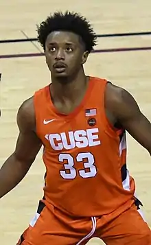Hughes decided to transfer to Syracuse over an offer from Seton Hall.[8] After redshirting a year due to NCAA transfer rules, during which he improved his strength and diet, Hughes was named a starter for the Orange going into his redshirt sophomore season. He was the team's second leading scorer with 13.7 points per game while also averaging 4.3 rebounds, 1.5 assists and 1.2 steals per game.[9][2] He took more three-pointers than any other teammate and made 36.9 percent of them.[1] Hughes scored a career-high 25 points in the season-ending loss to Baylor in the NCAA tournament.[3] Entering his junior season, Hughes was named to the watch list for the Julius Erving Award, which honors the top collegiate small forward.[10] On February 11, 2020, Hughes left a game against NC State early with a lower body injury.[11] At the conclusion of the regular season, Hughes was selected to the First Team All-ACC.[12] As a junior, Hughes averaged 19 points, 4.9 rebounds, and 3.4 assists per game. After the season, he declared for the 2020 NBA draft.[13]